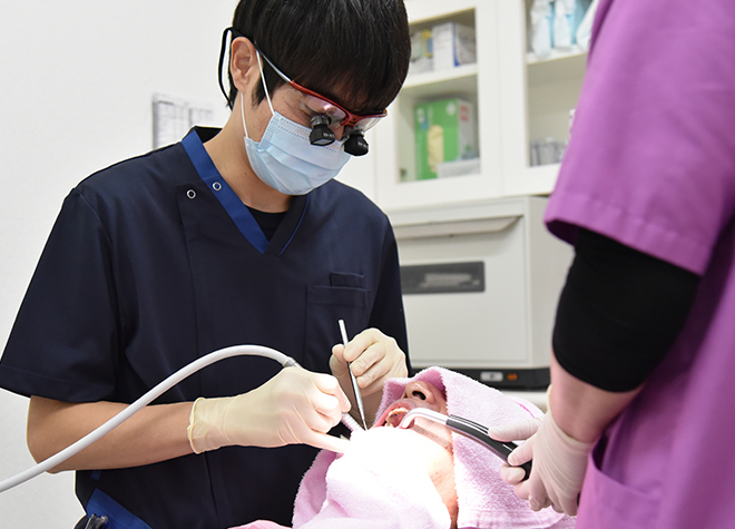 治療する際、私どもでは必ずアシスタントを付けています。それゆえ、歯科医師の方が治療に打ち込める環境だと言えるでしょう。